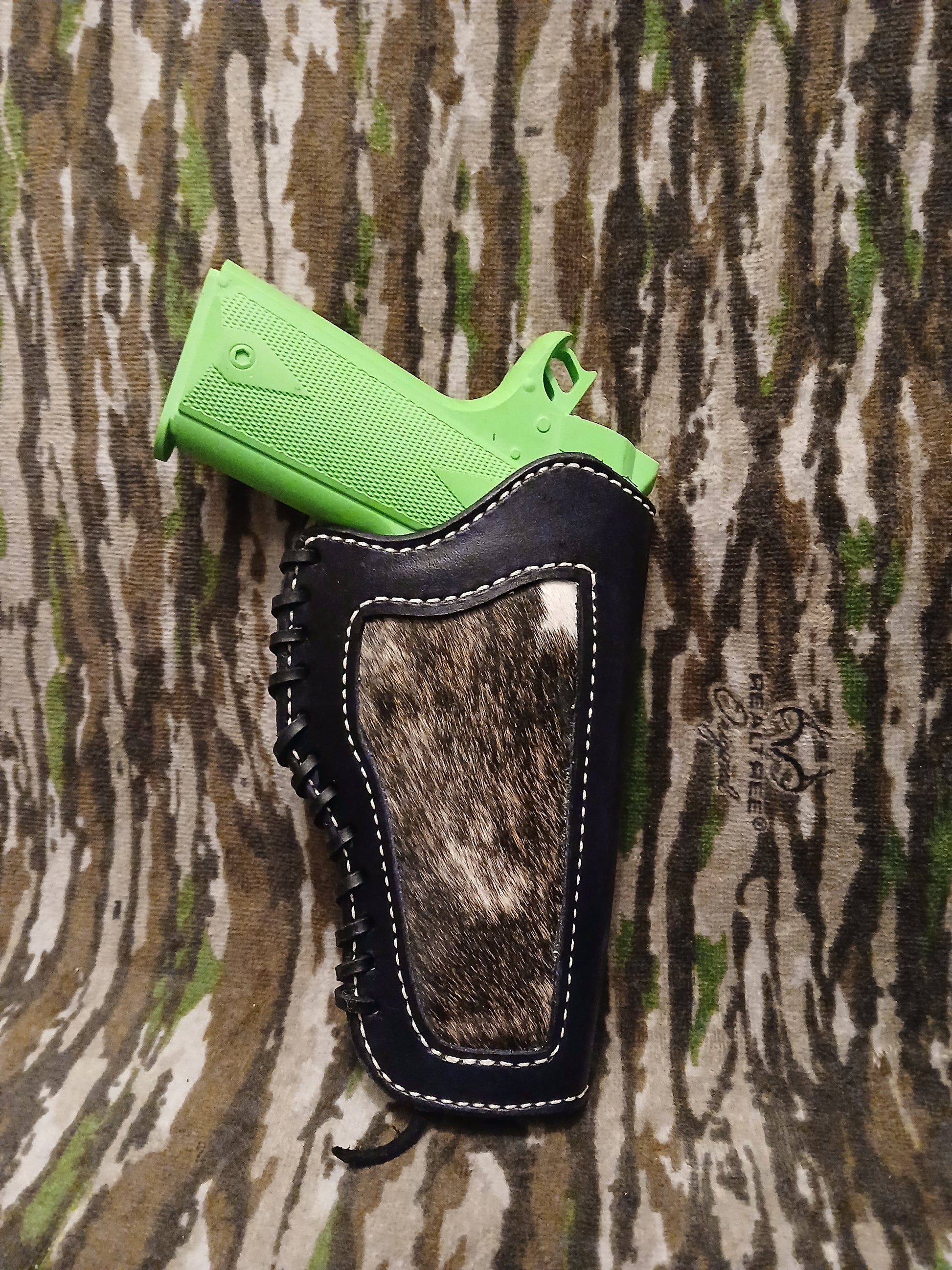 Black vegtan leather with hair on hide holster.